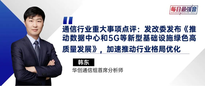 点评:此次发改委发文明确了数据中心绿色高质量发展的目标及六大主要任务。发展目标:到2025年,数据中心和5G基本形成绿色集约的一体化运行格局。数据中心运行电能利用效率和可再生能源利用率明显提升,全国新建大型、超大型数据中心平均电能利用效率降到1.3以下,国家枢纽节点进一步降到1.25以下,绿色低碳等级达到4A级以上。全国数据中心整体利用率明显提升,西部数据中心利用率由30%提高到50%以上,东西部算力供需更为均衡。5G基站能效提升20%以上。数据中心、5G能耗动态监测机制基本形成,综合产出测算体系和统计方法基本健全。在数据中心、5G实现绿色高质量发展基础上,全面支撑各行业特别是传统高耗能行业的数字化转型升级,助力实现碳达峰总体目标,为实现碳中和奠定坚实基础。主要任务:1)强化统筹布局。优化数据中心建设布局,支持东部地区非实时算力需求,向西部地区转移。鼓励数据中心骨干企业率先完成布局落地。严格控制国家枢纽节点之外新建数据中心,加强对数据中心建设的统筹指导力度,坚决避免数据中心盲目无序发展。2)提高算力能效。支持基础电信运营企业开展5G网络共建共享和异网漫游。加快推动老旧高能耗设备退网和升级改造,推动智慧多功能灯杆建设。发布国家绿色数据中心名单。新建大型、超大型数据中心电能利用效率不高于1.3,逐步对电能利用效率超过1.5的数据中心进行节能降碳改造。对于区域内数据中心整体上架率(建成投用1年以上)低于50%的,不支持规划新的数据中心集群,不支持新建大型和超大型数据中心项目。3)创新节能技术。鼓励使用高效环保制冷技术降低能耗。支持数据中心采用新型机房精密空调、液冷、机柜式模块化、余热综合利用等方式建设数据中心。加快节能5G基站推广应用,支持碳化硅射频器件等高效节能技术攻关。4)优化节能模式。鼓励在数据中心和5G网络管理中应用人工智能技术,因地制宜促进数据中心节能降耗。5)促进转型升级。充分发挥数据中心、5G在促进传统行业数字化转型方面的重要支撑作用,推动煤炭、钢铁、水泥、有色、石化、化工等传统行业加快“上云用数赋智”步伐,将“瓦特”产业转化为“比特”产业,依靠产业跨越升级实现低碳绿色发展。我们认为,此次《实施方案》着力引导行业尽快出清高能耗数据中心,提升绿色能源使用率,均衡全国范围内数据中心的算力供需,各地将继续推出相应政策保证实施方案落地,加速推动数据中心行业格局优化。行业加速出清,数据中心租金有望触底反弹。2020年数据中心投资热潮下,2021年上半年IDC市场供给大幅增加,一定程度上造成数据中心租金下滑。2021数据中心报建项目规模下降,在国家明确碳中和目标的背景下,各地出台的数据中心政策对能耗指标要求不断提高,一线城市数据中心稀缺性将更严峻,同时节能要求趋严带动数据中心进入门槛提高,数据中心价格有望触底回升。相关受益标的为一线核心资源丰富、已具备集群化规模资源且后期扩张能力充足的第三方数据中心厂商宝信软件、光环新网、数据港、奥飞数据;数据中心上游高速光模块厂商新易盛、中际旭创;数据中心精密温控厂商英维克、佳力图等。