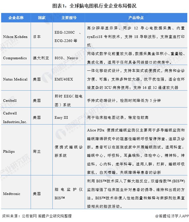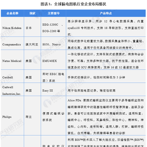 美国、欧洲和日本等发达国家在脑电图机制造领域处于技术与市场领先地位,部分企业通过上市与收购兼并等手段进行扩张,发展成为世界级企业,其产品种类繁多,产能及产量较大,品牌知名度及市场占有率较高。国际主要的脑电图机制造厂商主要有日本NihonKohden、澳大利亚Compumedics、美国Natus Medical等等,专注于包括脑电图机在内的各类生命体征监测仪器的研发、生产与销售,部分企业还也提供本品牌设备配套耗材。