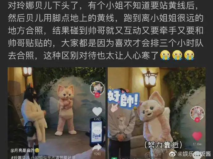 有网友指出,玲娜贝儿“媚男”,对女游客爱理不理,对男游客却热情似火,甚至看到帅哥就要主动“贴贴”;还有网友爆料,玲娜贝儿在土豪女儿的生日宴会上大献殷勤,但对普通游客却越来越敷衍。