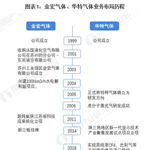 现阶段中国电子特气龙头企业包括金宏气体、华特气体,两家企业在电子特气业务上的布局历程如下: