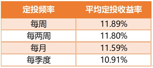 从测算结果可以看到:随着定投频率的不断提高,平均定投收益率会随之提升,但收益率提高的效果也在逐渐减弱。