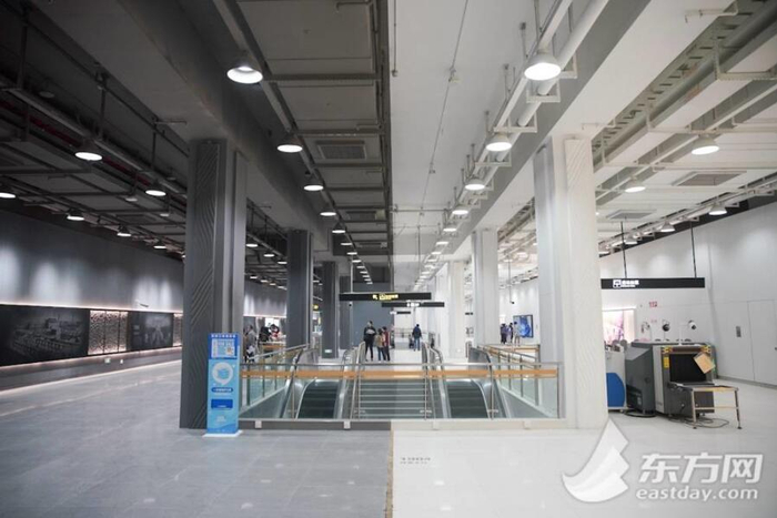 18号线一期北段采取无吊顶裸装,秀出了工业“马甲线”。东方网记者在龙阳路看到,18号线全线取消了车站的吊顶,采用露出车站结构板和各类管线的裸装风格,墙面及立柱采用整块的大尺度面板装饰,视觉上更凸显空间的景深效果。