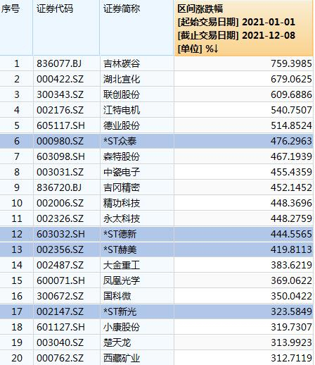 仅以2021年为例,包括北交所A股在内,至12月8日涨幅排名前20名的个股中,同样也出现了*ST众泰、*ST德新、*ST赫美和*ST新光4只个股。