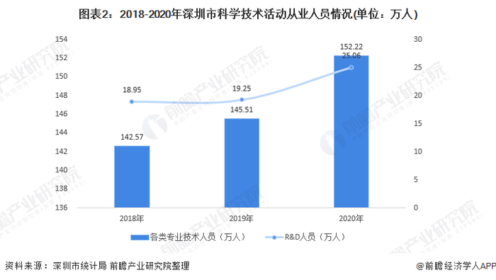 2018-2020年深圳市科技活动从业人员逐年上升,2020年深圳市具有各类单位专业技术人员为155.22万人;其中规模以上工业企业R&D人员为25.06万人