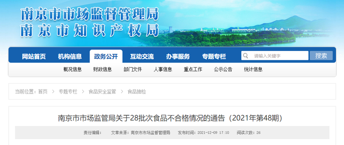 南京市市场监督管理局关于28批次食品不合格情况的通告(2021年第48期)