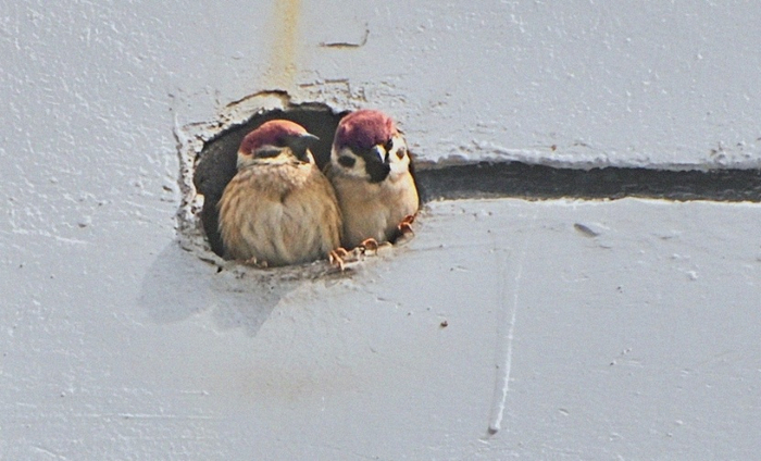 在建筑外墙中搭窝的麻雀(摄影:俞远明)