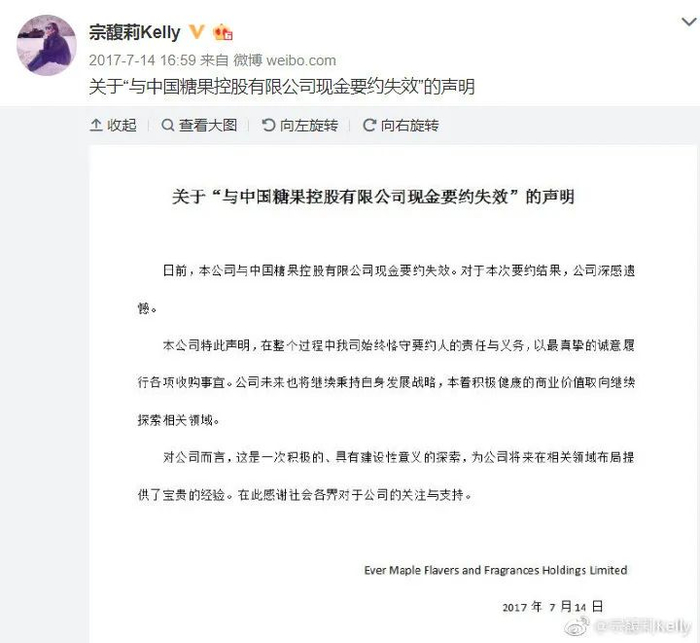不过,消息传出后,中国糖果股价高涨,最终收购失败,当时宗馥莉回应称:“对于本次要约结果,公司深感遗憾,在整个过程中我司恪守要约人的责任与义务,以最真挚的诚意履行各项收购事宜。”