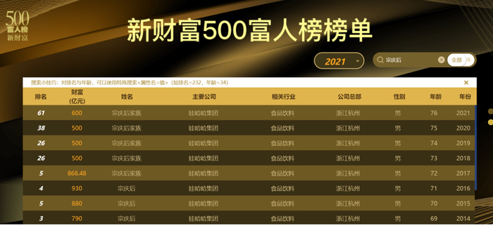 据新财富500富人榜,宗庆后家族多年上榜,2021年其以600亿元财富排名61位。