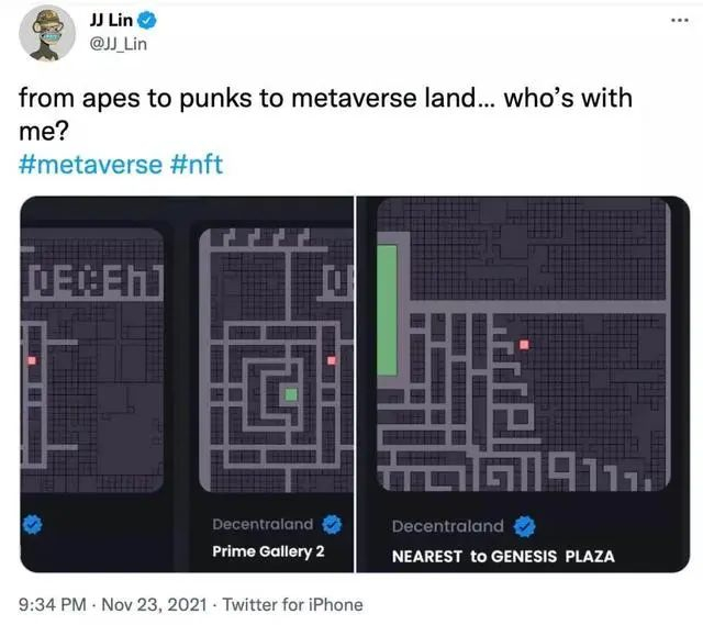 而作为娱乐圈出了名的游戏玩家,歌手林俊杰也是虚拟地产的拥有者。据悉,林俊杰在Decentraland购买了三块“土地”花了大约12.3万美元,约合人民币78.4万元。