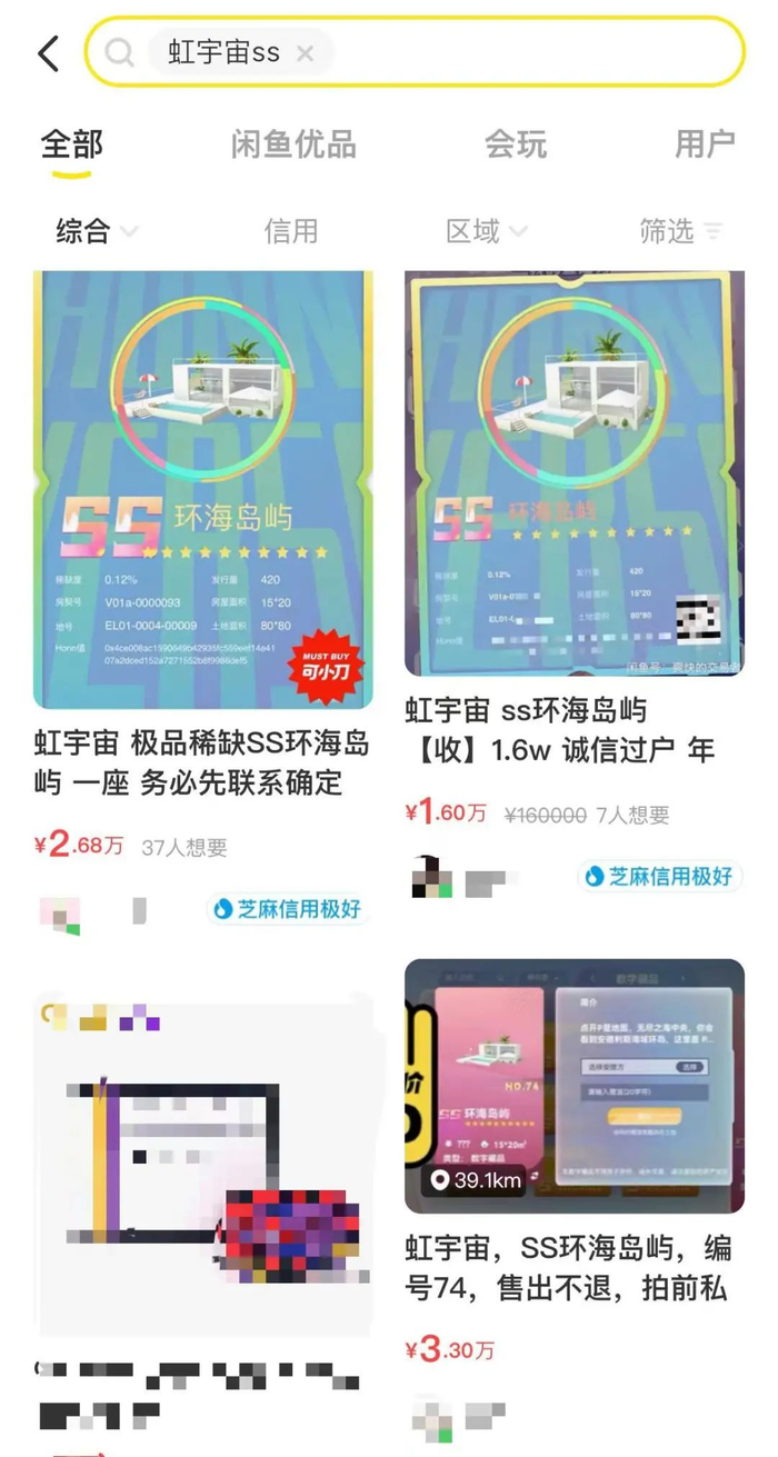 这些限量发行的房型在闲鱼上一时形成了“炒房热”。此前,最夸张的一套虹宇宙虚拟房产“SS环海岛屿”甚至炒到了99.99万元。截至目前,咸鱼上仍有多套虚拟房产价格破万。
