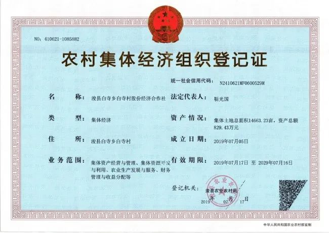 试点改革申请获批后,白寺村村委通过清产核资、身份界定、股份量化等程序推进产权制度改革工作。对全村1513户现有土地产权根据承包面积进行股权确认登记,共确认股权10889.6股。