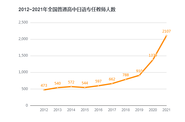 直到2017年下半年,教师认定资格考试中才增加日语等小语种学科。根据教育部最新数据,2020~2021年度全国普通高中日语专任教师达2107人,英语老师则有281941人。目前,多数学校采取与校外日语机构合作的方式, 将日语课程的教学任务“外包”。