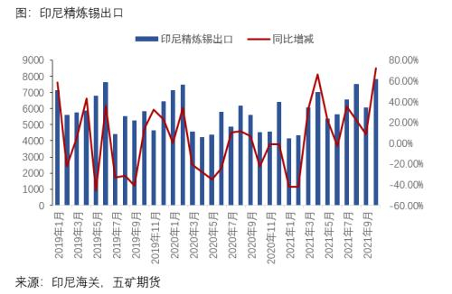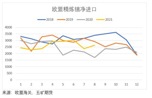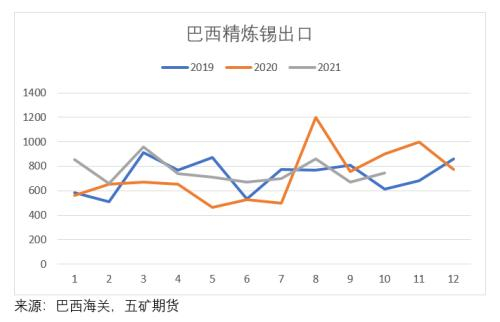 与印尼相比,马来西亚全年精炼锡出口量经历了高开低走,再从低位逐步恢复的过程。在四月MSC宣布减产前,马来西亚每月出口数量维持在了较高的水平。但随着疫情马来西亚疫情在2021年中的爆发,马来西亚对外出口锡锭数量锐减,在8月一度降至515.6吨。9月底随着MSC宣布产能恢复,马来西亚的出口开始有所恢复。后市预计MSC方面的产量会逐步恢复到往年正常水平。