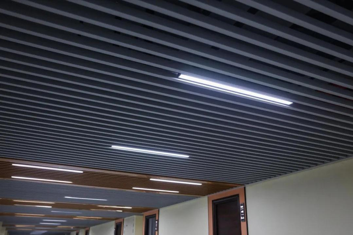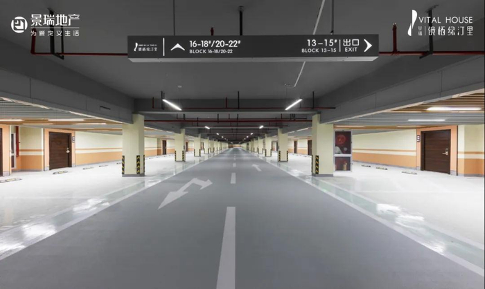 车库吊顶,采用新型木塑复合材质格栅,美观又大气,在住宅小区地下车库中比较少见,再加上车库内密集的顶灯布局,给人一种宛如购物中心地下车库般的明亮大气感。