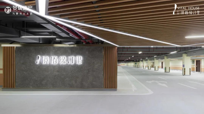 车行进入地下车库后,迎面而来是印有“镜栖绿汀里”的大理石艺术景墙,给业主一种归家的提示。