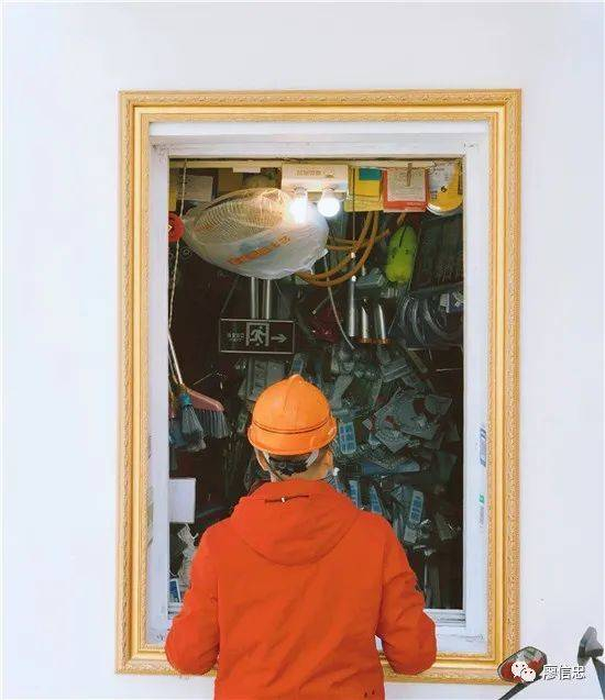 比如法华镇上的小姜五金店,当年整排门面封墙补洞,商户只能靠开窗做生意,艺术家的小巧思,索性将门面做为一幅画,老板坐在里面,就象是画中人。