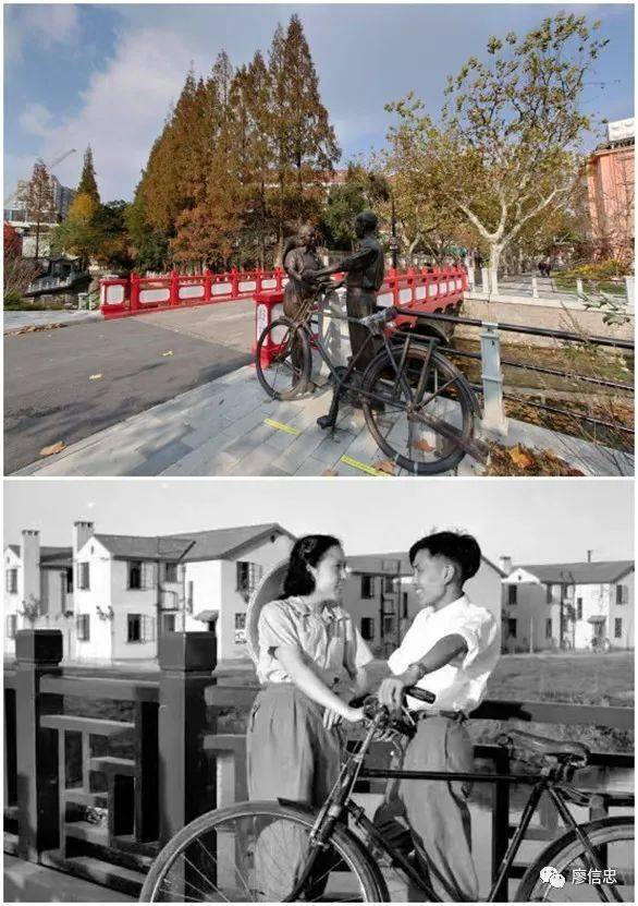 曹杨地区的空间艺术季主题自然围绕着曹杨一村展开,比如红桥边上的这座雕塑,一对推着自行车的劳模夫妻,这是参考了当年《解放日报》上在红桥上拍摄的一张照片创作而成。