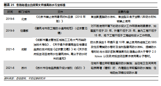 成都、苏州陆续提高防水标准,行业提标渐成趋势。防水属于典型的隐蔽性工程,大量中小企业生产非标伪劣产品进行低价竞争,因此行业规模尽管多达2000亿元左右,但市场集中度仍低。2019年住建部发布《建筑与市政工程防水通用规范》征求意见稿,拟大幅提高行业防水标准。2021年5月,成都发文拟要求防水质保由5年提升至10年,禁用热熔型SBS防水卷材、溶剂型建筑防水涂料;6月苏州亦发文要求轻质隔墙应采取整体防水措施。