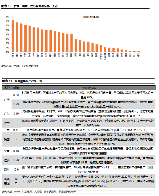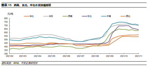 分区域看,西南、东北、华北水泥涨幅居前,与限电限产力度相一致。截至11月26日,五大区域42.5级袋装普通水泥价格涨幅分别为西南66%、东北54%、华北32%、中南31%、华东28%、西北25%,区域涨幅与限电限产力度基本一致。