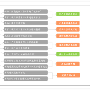 第二条主线是关注“碳中和”下绿色建材行业机会:“碳中和”目标下发展低碳环保的绿色建筑乃大势所趋,Low-E等节能建筑玻璃应用空间广阔,未来渗透率有望逐步提升;光伏发电作为能源结构改革和能源替代的重要方向,2022年随着硅料价格回落、光伏装机需求向好,对光伏玻璃量价形成支撑,长期看光伏终端需求持续成长确定性高,叠加双玻渗透率提高,光伏玻璃将充分受益。