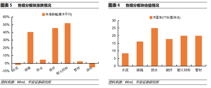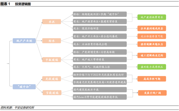 短期考虑地产政策持续修复,建议关注地产产业链估值修复机会,长期来看,建议关注提标机遇下的防水板块,以及“双碳”目标下光伏玻璃、节能玻璃等新兴材料投资机会。
