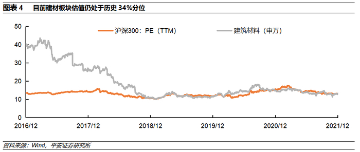 从估值看,截至2021/12/3,申万建筑材料板块PE(TTM)约13倍,估值处于近五年34%分位,处于申万28个行业中第22位。