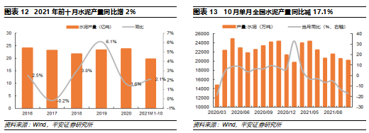 能耗双控背景下,九、十月全国水泥产量显著下滑。2021年9月、10月单月全国水泥产量分别同比降13.0%、17.1%,降幅环比明显扩大;1-10月全国水泥产量19.7亿吨,同比增2.1%,增速较2020年全年上升0.5pct。