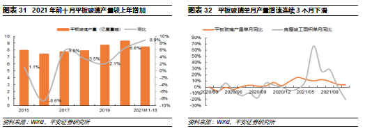 地产竣工支撑玻璃需求,但下半年房企资金压力制约需求释放。2021年1-10月全国平板玻璃产量8.4亿重量箱,同比增长8.9%,增速较2020年全年上升2.3pct。下半年地产资金环境偏紧、部分房企信用事件频发,对竣工节奏形成扰动(10月单月竣工同比降20.6%,增速环比降21.6pct),下游拿货节奏放缓,导致玻璃需求放缓。10月平板玻璃产量同比增长3.7%,增速连续3个月下滑。