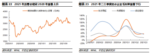 三是年初以来沥青价格大幅上涨,防水生产成本压力骤增。防水企业销售方式包括直销与经销模式,其中经销模式面向经销商,防水企业议价能力强,价格传导路径较为顺畅;但直销客户群体的产品价格通常提前一段时间锁定,导致年初以来沥青价格大幅上涨难以及时传导至下游直销客户。2021年二三季度东方雨虹、科顺股份等防水龙头毛利率普遍下行。