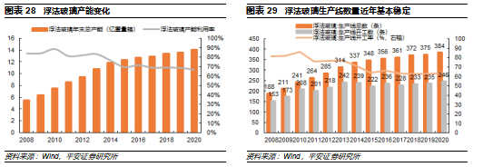 近年玻璃在产产能增幅不大、整体稳定。2015-2020年浮法玻璃总产能从12.33亿重量箱微增至14.02亿重量箱,在产产能从8.6亿重量箱微增至9.4亿重量箱,产能利用率从70%降至67%;生产线总数从348条增至384条,其中开工数从222条增至246条。