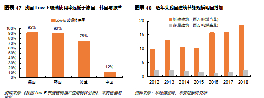 国内建筑能耗水平高,Low-E玻璃使用率低。我国建筑能耗约占全国总能耗三分之一以上,建筑单位能耗水平约为欧洲4倍、美国3倍。节能建筑玻璃是以玻璃原片为基材,采用物理方法、化学方法及其组合对玻璃进行再加工,制成具有新的结构、功能或形态和高附加值的玻璃制品,具有美观、安全、节能等优点,主要应用于建筑门窗、玻璃幕墙等领域,可以有效降低建筑物能耗;根据制成工艺主要分为镀膜玻璃、中空玻璃、夹层玻璃等,镀膜玻璃中应用最广泛的为Low-E玻璃。据《我国Low-E节能玻璃推广应用现状分析》张萌、陈旭等测算,按全国每年新安装门窗4亿平米估算,若都采用Low-E玻璃,相比普通中空玻璃窗,每年可节能870万吨标煤、减少NOX和SO2排放8万吨、减少温室气体CO2排放2100万吨,16个月的节能量相当于我国浮法玻璃行业1年总能耗量。据张萌、陈旭等估计,节能玻璃在欧美发达国家普及率已超过80%,远高于国内(约12%)。