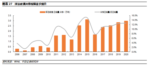 行业进入冷修高峰期,亦对玻璃在产产能形成约束。浮法玻璃制造具有高温、连续、不间断的生产特性,玻璃熔窑寿命一般为8-10年,到期需进行冷修且复产成本较高,一旦开窑难以随时关停。2009-2014年玻璃生产线投产较多,推算2017-2024年玻璃行业将处于冷修高峰期。2016-2020年全国浮法玻璃冷修日熔量从1.65万吨升至2.96万吨,占玻璃总日熔量比重从7.8%升至12.7%。