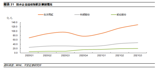 二是房企信用违约事件频发,防水企业坏账计提压力加大。防水企业通常会给予地产直销客户一定账期,即到货验收后支付大部分货款,剩余部分根据工程进度进行支付。随着恒大、蓝光、阳光城等多家大型房企爆发信用事件,相关房企的防水业务供应商将面临坏账计提压力。