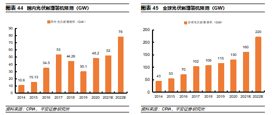 随着硅料组件价格下行,2022年光伏装机需求向好,对光伏玻璃量价形成支撑。考虑2021年四季度以来主要新建硅料产能逐步释放,上游原材料高价格对光伏装机需求的压制因素逐步缓解,预计光伏装机需求向好。根据平安证券电力设备团队预计,2021-2022年国内光伏新增装机约52GW、78GW,全球光伏新增装机约160GW、220GW。随着组件价格的下降,预计2023年全球及国内光伏新增装机有望实现20%及以上的增速。