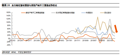 一是下游地产投资低迷影响防水需求,二三季度防水企业营收增长放缓。防水材料下游应用以住宅和民用建筑为主、基建为辅。从历史走势看,行业龙头东方雨虹单季度营收增速与房地产新开工单季度增速走势较为相近。2021年地产开工持续下行、基建表现疲弱,导致防水企业收入增速逐步下行。