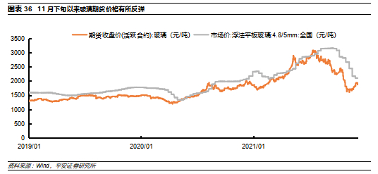 玻璃价格短期同样承压,后续关注竣工修复节奏。考虑玻璃供给端变动不大,价格主导因素为需求侧,库存累积下短期价格仍存下行压力;但若后续房企竣工回归正轨、下半年以来积压玻璃需求释放,玻璃价格将具备有力支撑,不排除小幅反弹的可能。实际上,玻璃期货收盘价自11月下旬以来已有所反弹。