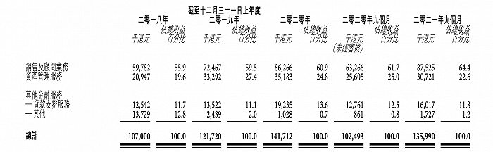 截至2021年三季度末,意博金融营收约1.35亿港元,同比增32%;销售及顾问服务业务营收8752千万港元,占比在64.4%;资产管理业务营收3072万港元,占22.6%;其他金融服务贡献13%营收,录得1774万港元,其中绝大部分涉及贷款服务。