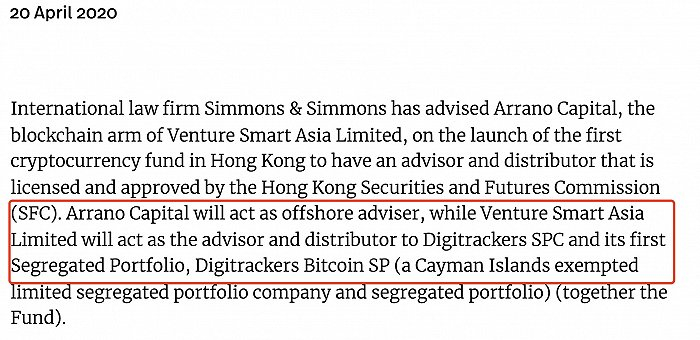 Arrano Capital的法律顾问Simmons&Simmons律所在2020年4月13日和20日发文,前文提及,其为Arrano Capital发行Arrano Alpha International Master Fund(Arrano Alpha Fund)做顾问服务,该基金涉及数字资产套利等。在其后的文章中,Simmons&Simmons表示,将为香港首个数字资产管理人和基金提供服务。该文中称,Arrano Capital将担任香港首只加密货币基金的离岸顾问,意博亚洲将担任DigTrackers SPC及DigiTrackers Bitcoin SP的顾问和分销商。