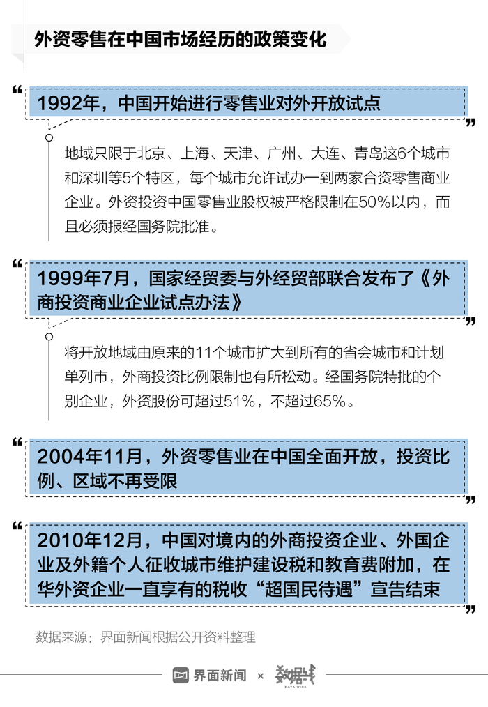 而在2001年11月中国正式加入WTO时,外资零售业在中国本土的零售布局已经相当活跃。
