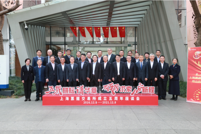 2021年12月8日,上海票据交易所成立五周年座谈会在沪举行。中国人民银行党委委员、副行长潘功胜,上海市委常委、常务副市长吴清,福建省委常委、副省长郭宁宁视频致辞。中国人民银行上海总部党委副书记、副主任兼上海分行行长金鹏辉,黄浦区区委副书记、区长沈山州现场致辞。上海票据交易所党委书记、董事长宋汉光主持座谈会并讲话。上海市地方金融监管局党委委员、副局长管小军,上海票据交易所党委副书记、总裁张翠微,党委委员、监事会主席周荣芳出席座谈会。