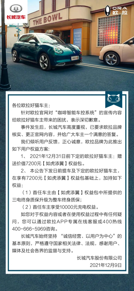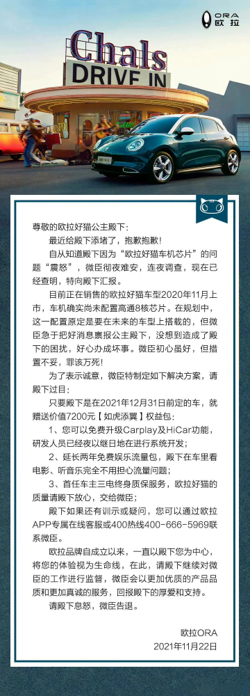 其实在11月22日,欧拉已经发布致歉声明了,赔付的内容就是升级CarPlay和HiCar,两年娱乐流量免费包以及首任车主三电终身质保。说是价值7200元,但是这三项权益的实际价值也都是欧拉自己定的,值多少钱也是欧拉说了算。