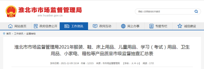 中国质量新闻网讯 12月9日,安徽省淮北市市场监督管理局网站发布2021年服装、鞋、床上用品、小家电、箱包等产品质量市级监督抽查汇总表。