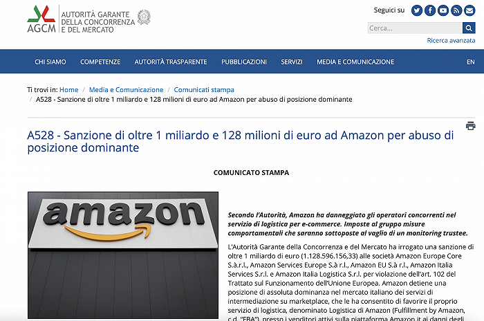 在声明中,意大利竞争与市场管理局(AGCM)表示,亚马逊在服务和物流领域的做法损害了其他市场参与者。