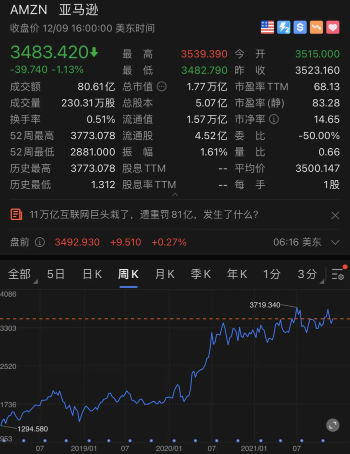 或许由于反垄断麻烦缠身,亚马逊在美股市场的表现明显落后于其他互联网巨头,截至当地时间12月9日收盘,亚马逊股价3483.42美元,下跌1.13%,总市值为1.77万亿美元(约合人民币12.7亿元),年内涨幅为6.95%,而同期的苹果、谷歌、微软、Facebook的涨幅分别高达32.8%、69.1%、51.9%、21%,也显著跑输了纳斯达克指数22.5%的年内涨幅。