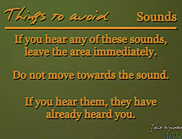 视频一开始,旁白还会正常地提示你在野外应该注意的各类事项,但当视频进行至中段,旁白开始严肃地让你警惕“大自然的嘲笑”和“幻听”,并给出了详细的应对措施:“如果听到这类声音,立马离开。”