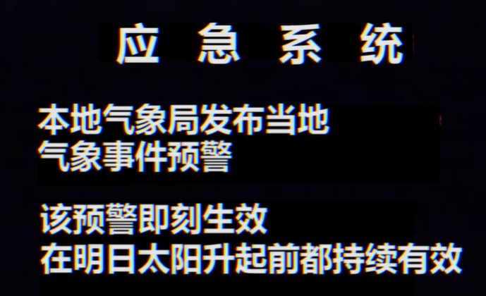 “气象服务”的内容如今看来或许有些既视感。在地方58台的午间节目开始之前,当地气象局打断了节目放送,并警告观众有异常气象事件发生,建议观众在警报结束之前不要走到户外观察这一气象事件。
