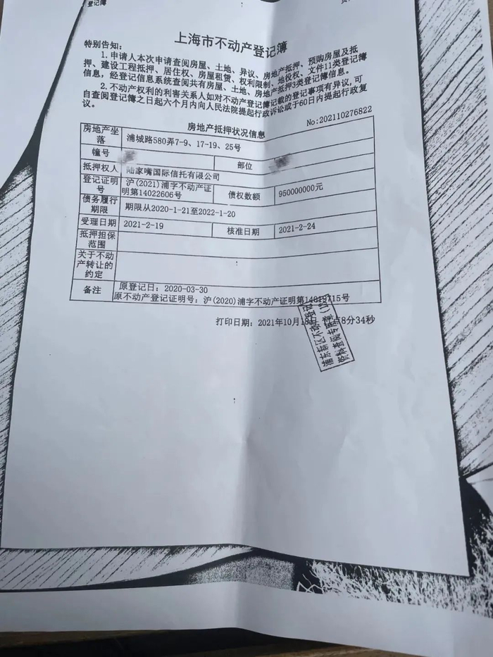 一份打印于10月18日的不动产登记薄显示,此次出售的浦城小区房源已被抵押给了陆家嘴国际信托有限公司(下称“陆家嘴信托”),期限从2020年1月21日到2022年1月20日,债券数额9.5亿元。