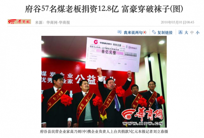 文中写道,在陕西,高乃则的知名度,远大于他的兴茂侏罗纪公司。昔日,伴随着陕北煤炭行业兴盛的天时地利,他由一个卖豆腐的小商户一跃成为陕北的“首富”,并因经常做慈善被媒体和大众关注。然而,因涉嫌行贿,一切皆成过往。