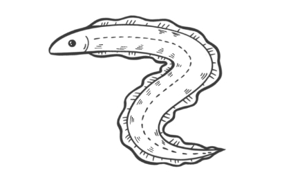 电鳗,淡水鱼,主要分布于南美洲亚马逊流域,以及圭亚那流域。身长可达2米,体重可达20公斤。头部宽扁,整体圆柱形,体表光滑无鳞。背部黑色,腹部橙黄色。电鳗眼睛小,视力有限,靠“电感”来探测周围环境。它不是真正的鳗类,而与鲇形目的种类近缘,因身长似鳗而得名。