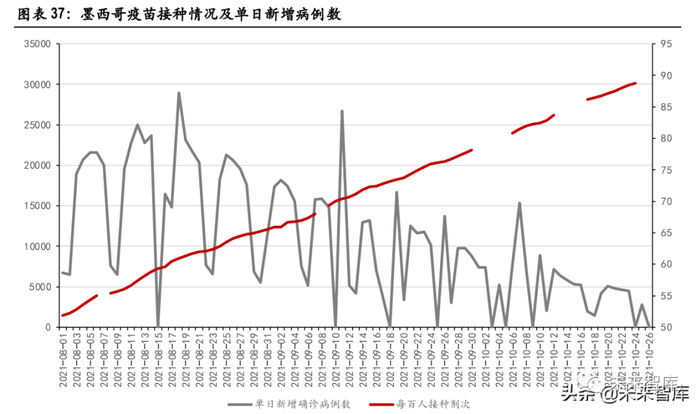2021 年 9 月,公司新冠 mRNA 疫苗相继获得海外的开展临床 III 期实验批准。9 月 1 日,公司获得墨西 哥、印度尼西亚药监部门的批准;9 月 23 日,获得尼泊尔药监部门批准。9 月 14 日公司首批外派团 出发开展海外临床和技术转移。海外临床相继获批显示该疫苗的初期数据得到其他国家监管部门的 初步认可,且该产品具有开辟海外市场的潜力。目前,海外新冠疫苗需求仍旧巨大。墨西哥人口约 1.3 亿人。截至 2021 年 10 月 24 日,每百人接种剂次 88.76,有 53.78 人接种至少一剂, 有 41.34 人完成主要免疫。假设目标疫苗接种率为 70%,尚未开始主要免疫程序的人数约 2109 万,以 2 剂次/人计算,折合 4218 万剂疫苗的市场空间,且没有考虑潜在的加强针市场。